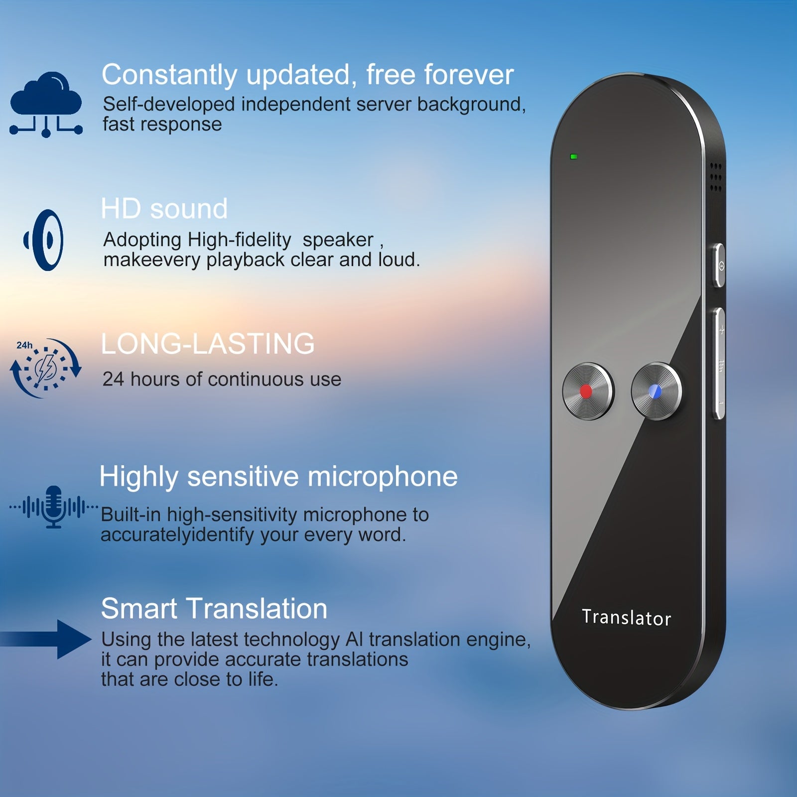 Introducing the ultimate travel companion for a borderless world — the Portable AI Voice Translator Device. Designed for globetrotters, business professionals. this sleek, pocket-sized device delivers instant, wireless, two-way voice translation across 125+ languages with remarkable accuracy. Whether you’re ordering food in Tokyo, negotiating in Berlin, or asking for directions in Rio, our advanced AI-powered technology captures speech in real time and responds naturally. Built-in high-sensitivity microphones With USB rechargeable battery life that lasts all day, it’s lightweight, durable, and ready to go wherever your journey takes you.
